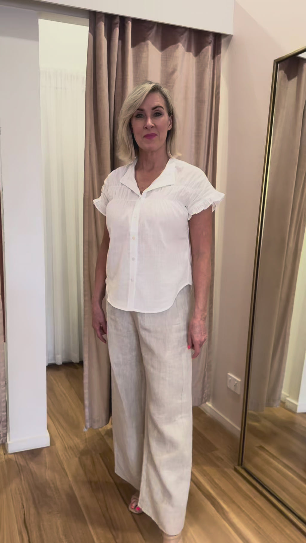 True to size. Model is 170cm tall and wears a Size 8. Lindy (in video) is 161cm tall, typically a Size 8 and wears a Size 8 in this shirt.