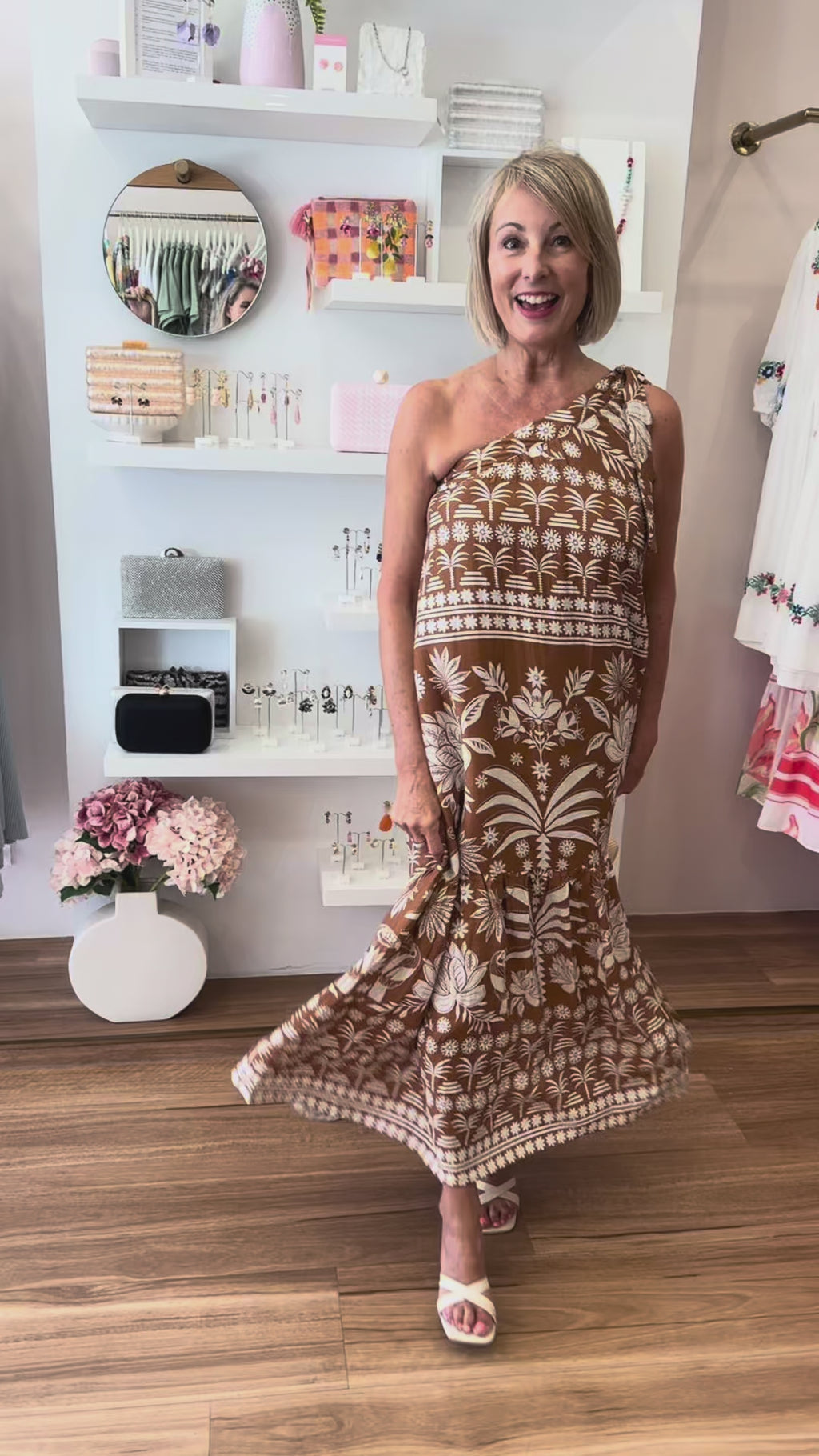 Our gorgeous Olina One Shoulder Maxi Dress will have you feeling those endless vacay vibes. Made from a lightweight fabric with an exclusive Hawaii print (coffee and cream tones), this feminine style has a lovely tie accent on the shoulder and a flowing skirt. This dress can be worn casually with slides or style her up for a special occasion with heels and a clutch.
