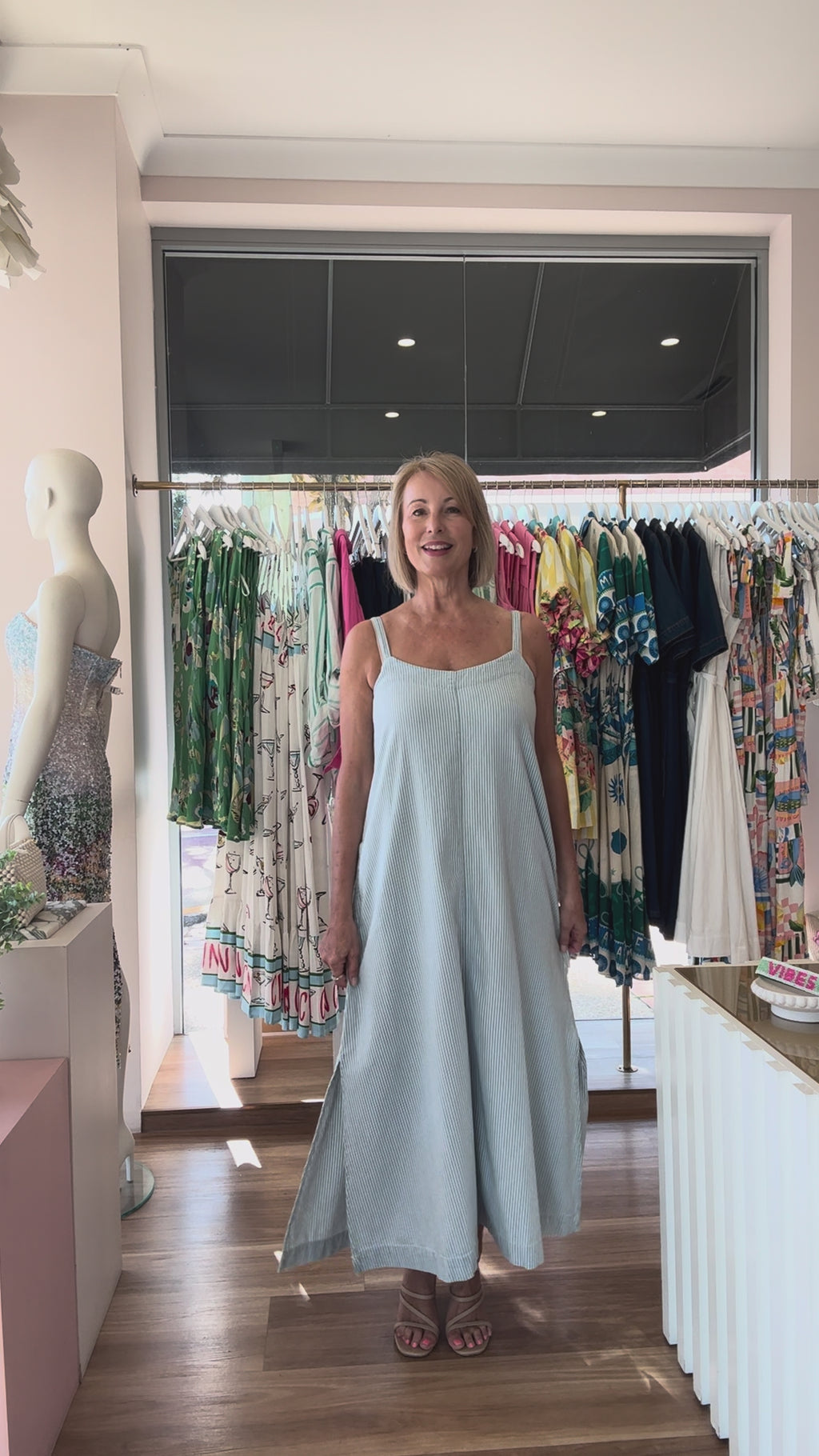 Meet our Remy Strappy Midi Dress by Ceres Life. Crafted using an organic cotton denim fabric with pale blue and white stripes, this dress features side pockets and adjustable shoulder straps for the perfect fit. Wear it to a picnic in the park or whilst you're out and about doing chores - pair it with our Orabella slides (showcased in video).