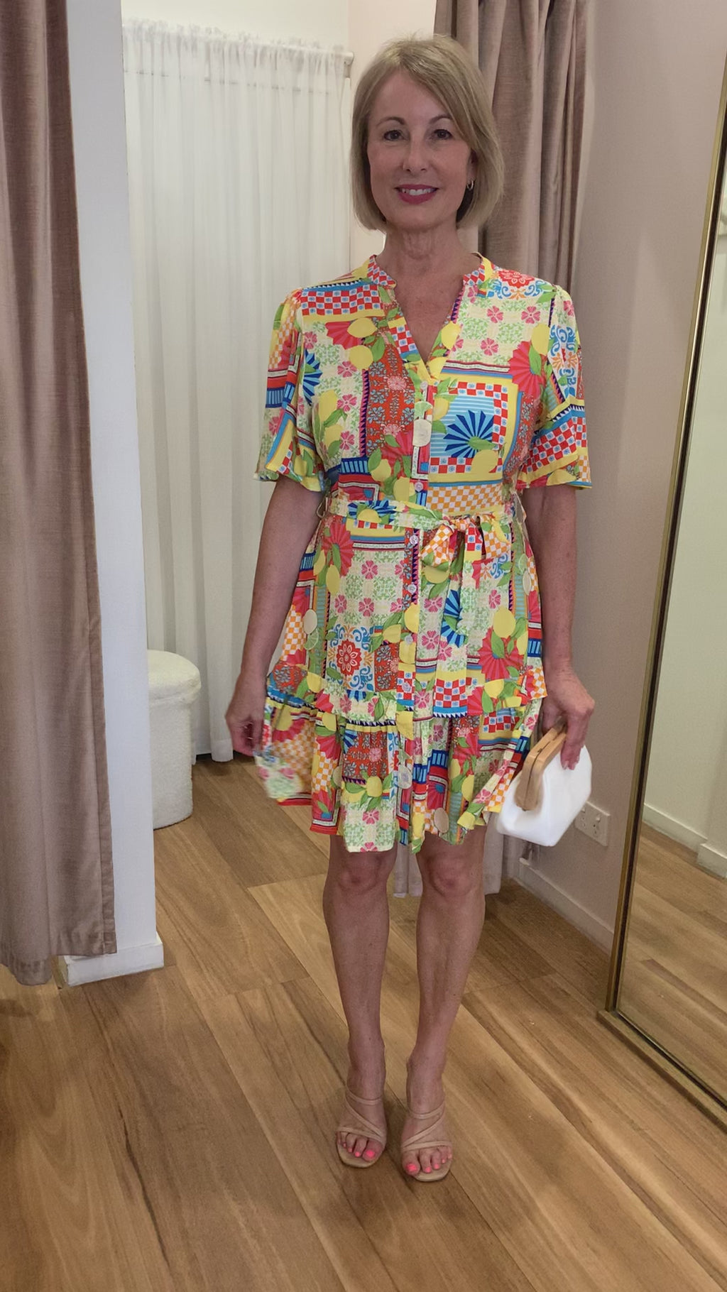 Our Sunnie Dress is one of those effortless styles you can rely on to take you from the shops to a lunch or dinner date. With an exclusive print in colourful tones of yellow, blue, red and green, this dress features a button front, frill sleeves and gorgeous crochet detailing down the front and along the hem of the skirt. Keep her casual with sandals or style her up with heels and gold accessories.