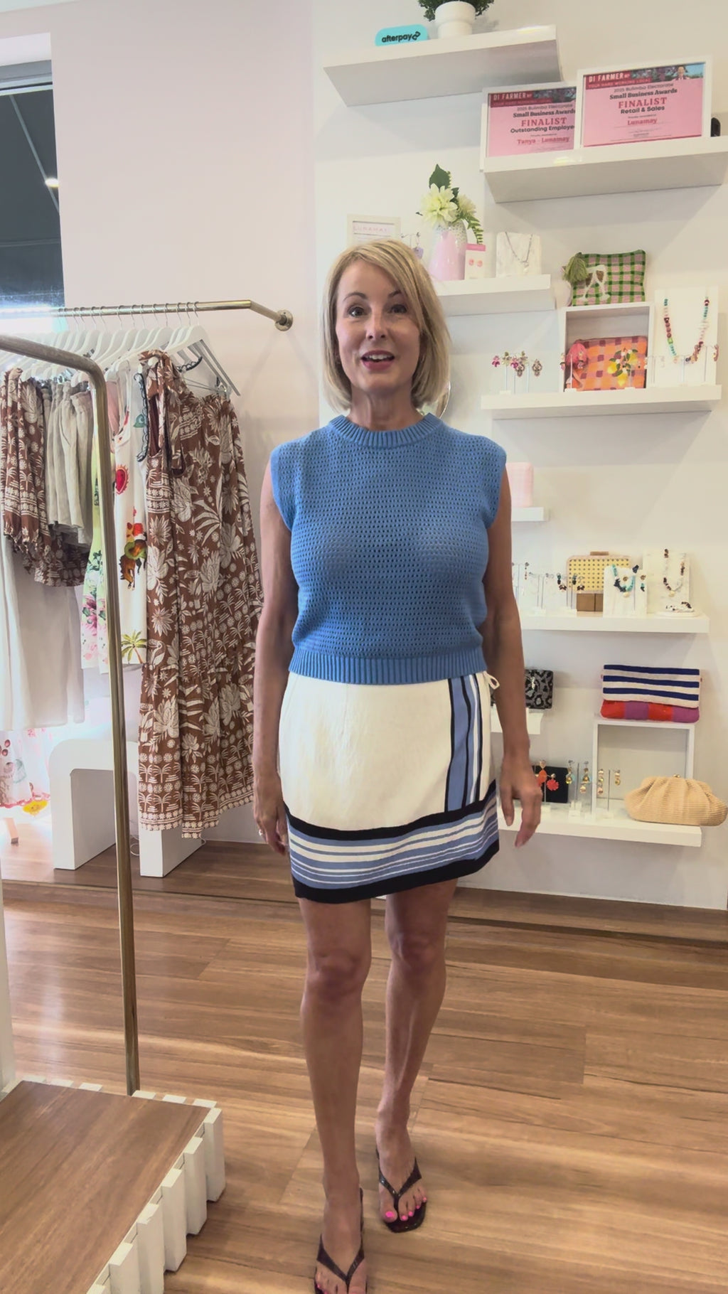 True to size. Model is 178cm tall and wears a Small. Tanya (in video) is 165cm tall, typically a Size 8-10 and wears a Medium in this skirt.