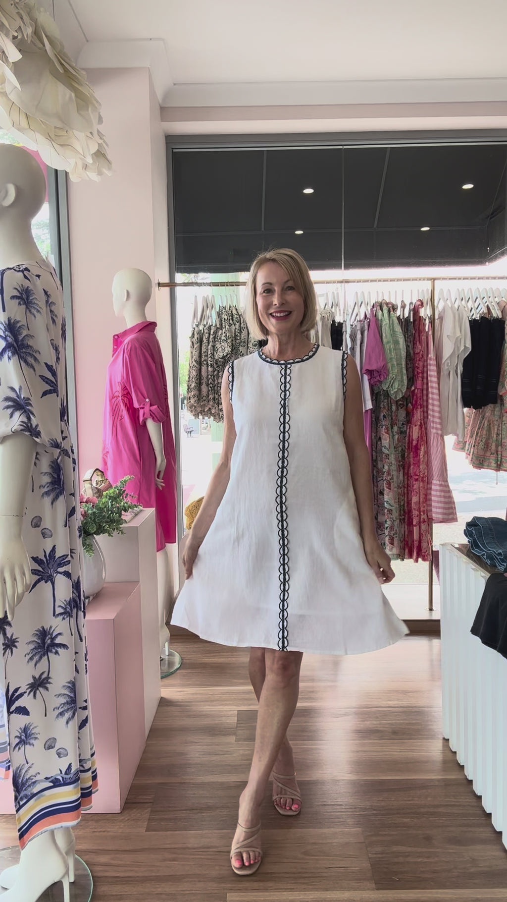 The Maya Dress from Azure & Indigo is destined to become your go-to favourite. Featuring a timeless shift silhouette and sleeveless design, it flatters a variety of body types effortlessly. Crafted from breathable, lightweight linen, it ensures comfort all day long. Delicate scalloped navy embroidery adds a refined touch, while practical pockets complete this effortlessly chic dress.