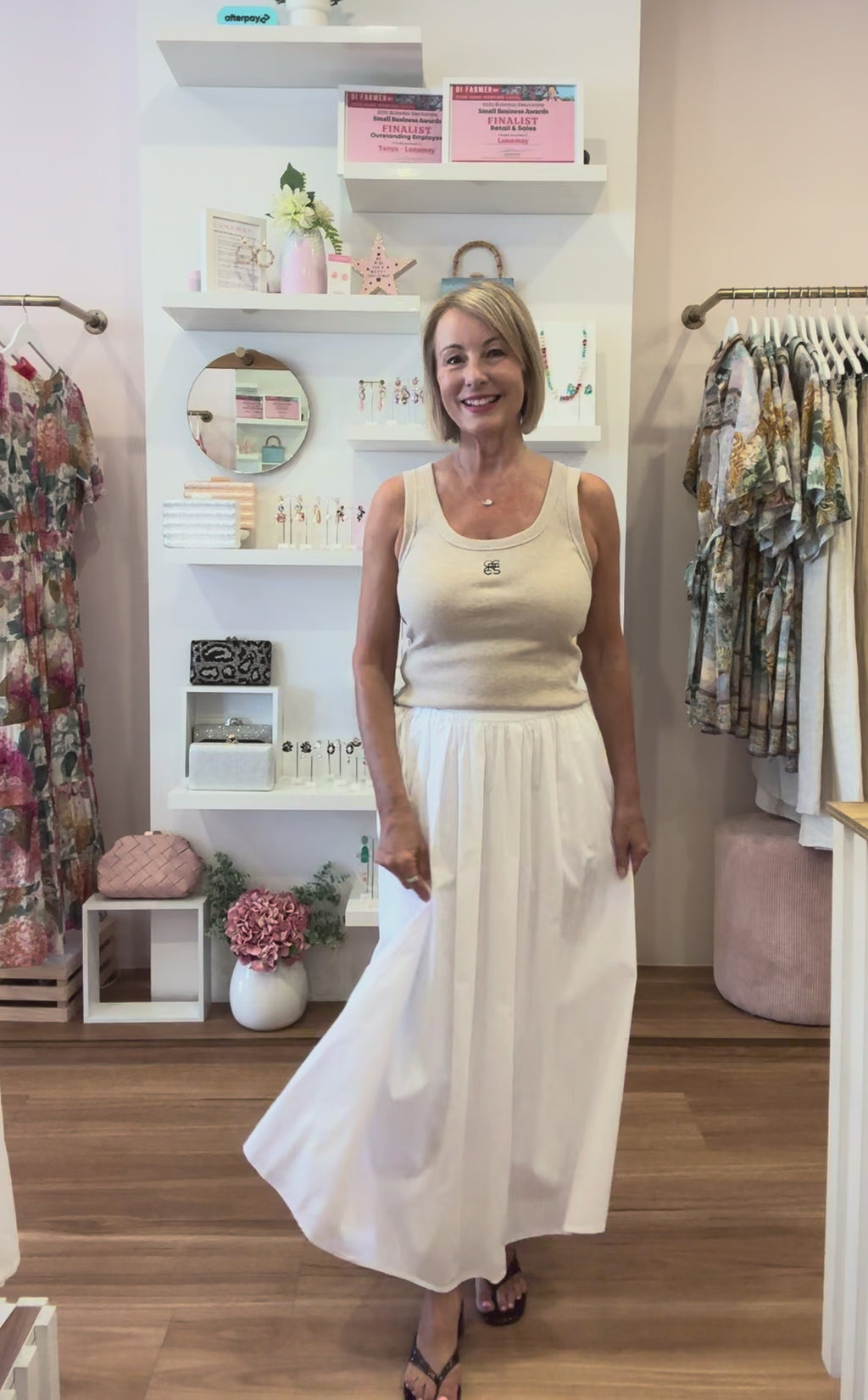 Crafted from an organic cotton poplin, our Ceres Florence Maxi Skirt will elevate your off-duty wardrobe. This classic white maxi skirt features an elastic waistband and side pockets. Effortlessly stylish and versatile - wear it during Summer with a tank or when its cooler, pull on a jumper and ankle boots.