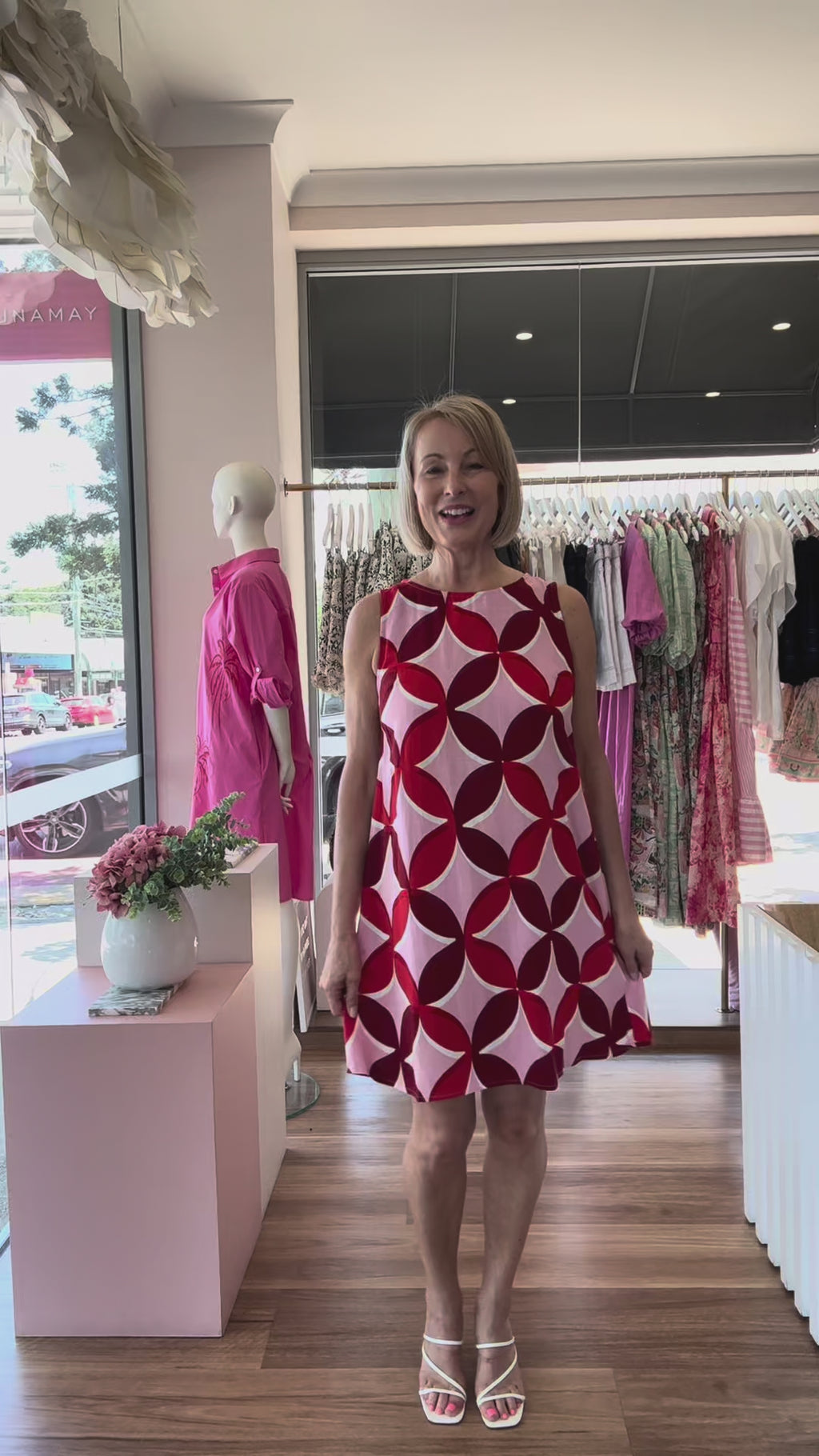 You will have comfort and style in our Bambina Mini Dress. This classic shift dress is made from a lightweight fabric with a pink and red statement print and it has a relaxed Aline shape which means it won't hug through the mid-section. This easy one and done style looks fab paired with our Ravielle Slides for those casual days or style her up with white heels and a natural coloured clutch.