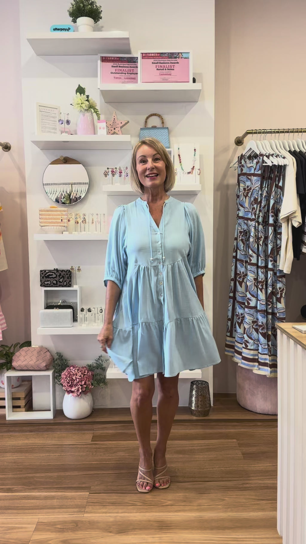 Our Blake Dress is a fab 'one and done' outfit. Made from a lightweight textured fabric in a light blue colour, this babydoll style dress features a button front, half length sleeves, tiered short skirt and it also has pockets. This easy wearing style will no doubt be on high rotation. Keep her casual with slides or style her up with heels and silver accessories.