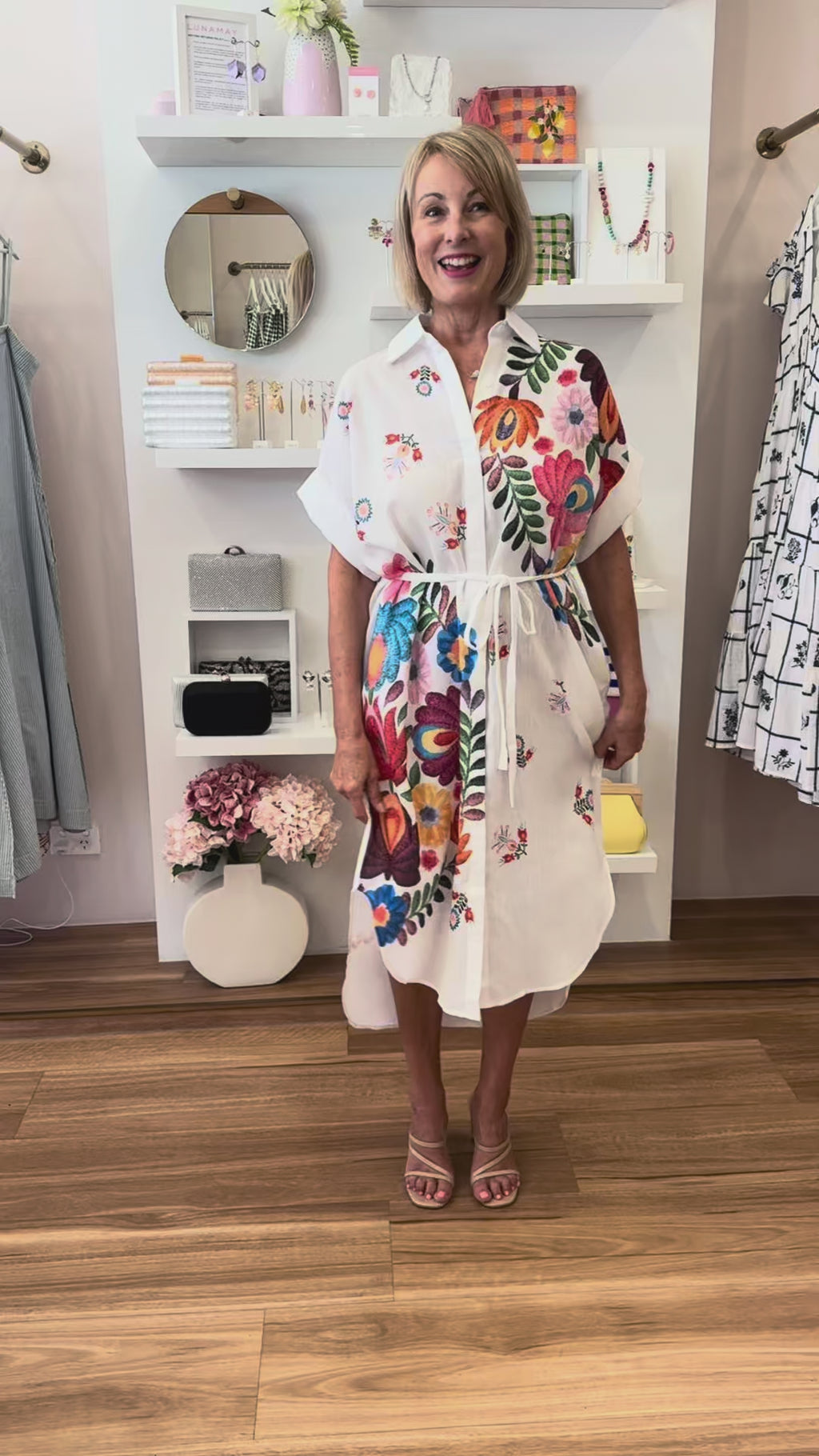 You will fall in love with our beautiful Botanical Shirt Dress. Crafted from lightweight textured fabric with a white base and a colourful botanical floral print, this shirt dress features a button front, short sleeves and convenient pockets. It has a relaxed fit which can be cinched in at the waist using the self fabric waist tie or keep it loose flowing. Wear it during the day with slides and style her up for dinner with heels and a pink clutch.