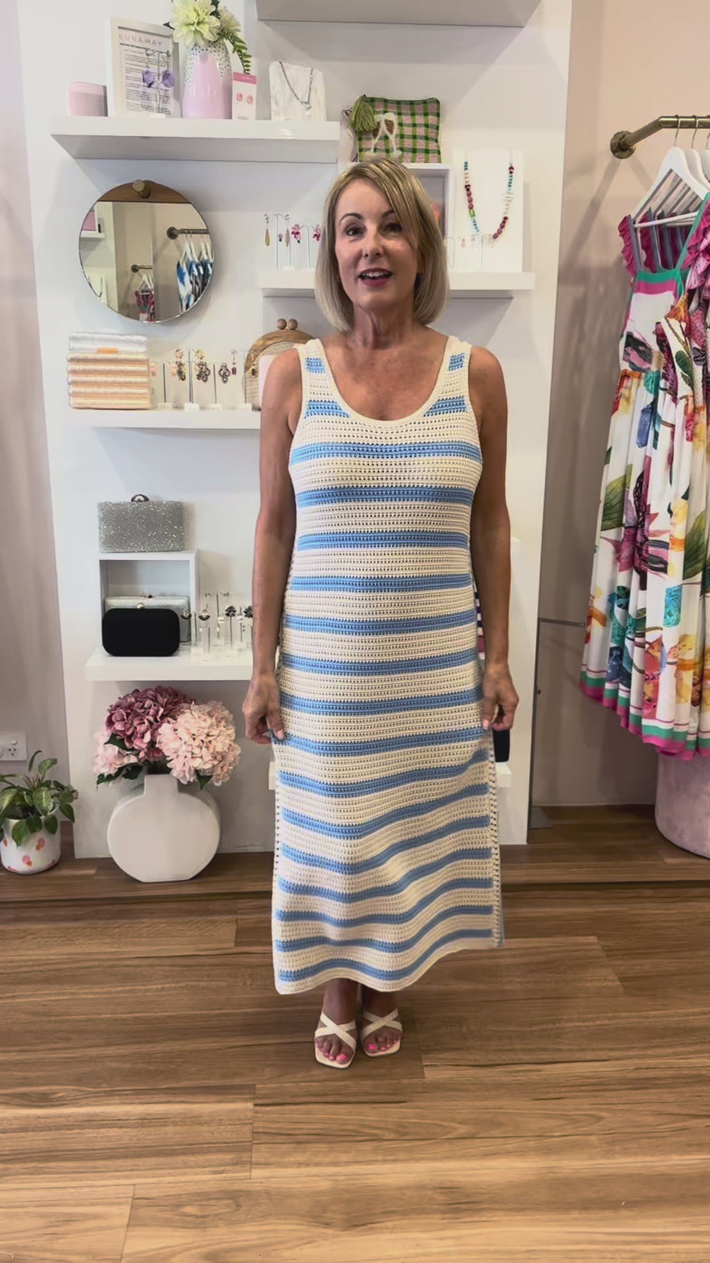 Feel effortlessly chic and put-together with our Ceres Talulah Knit Midi Dress. Made from a mid-weight knit, this cream and blue stripe dress has a timeless silhouette, perfect for any season and can be easily styled with slides in the Summer and when it gets cooler, add a denim jacket. Its also bump friendly and comfortable to wear from day to night.