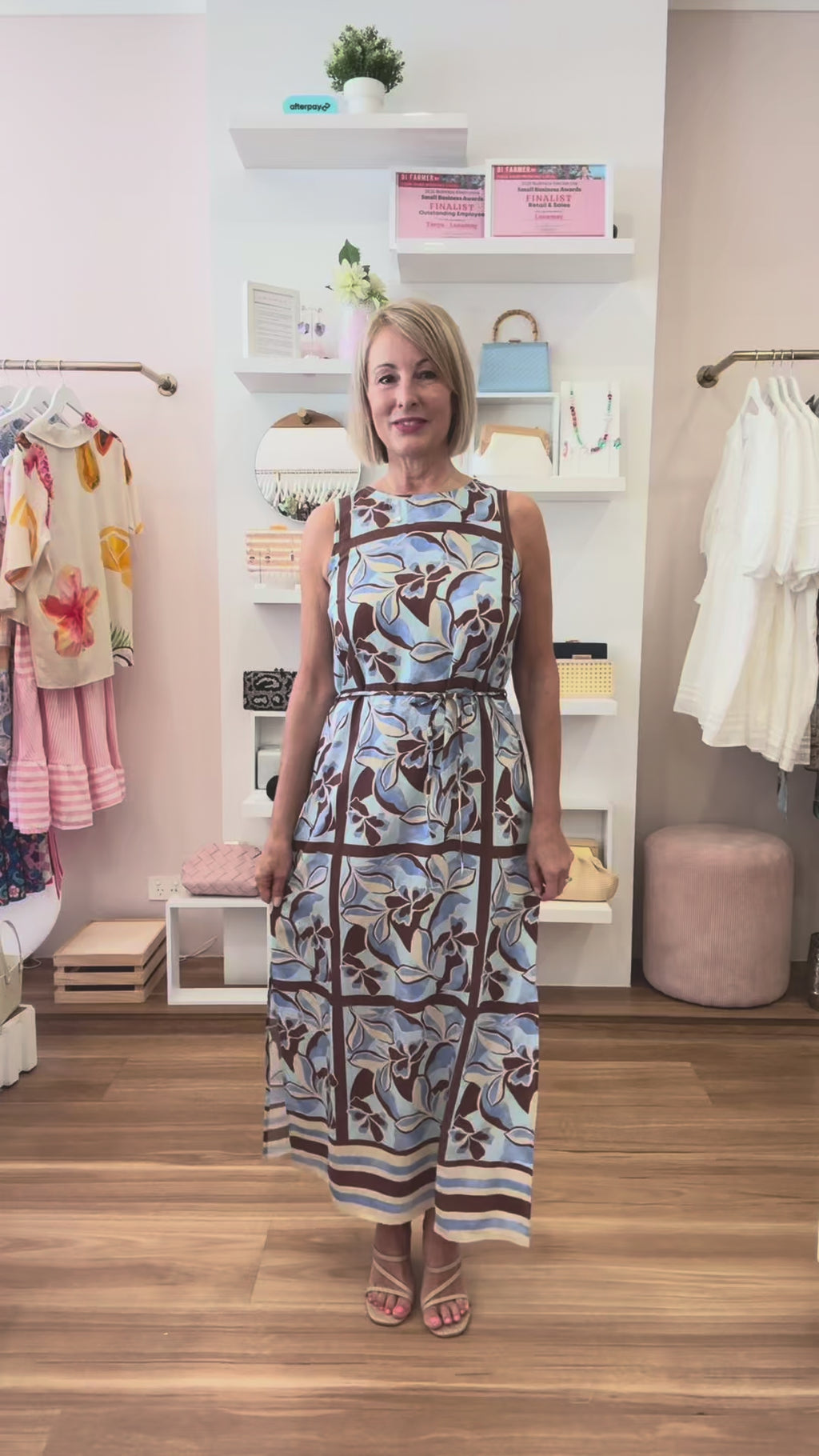 Our Cielo Floral Dress will have you Summer ready! Crafted from a super lightweight and soft viscose blend fabric with an exclusive abstract print in sky blue, chocolate and ivory tones, it features a sleeveless, body-skimming sheath silhouette. Use the waist ties to create shape or keep it loose flowing. This gorgeous midi dress is an easy pull on style that will make an effortless statement for any occasion.