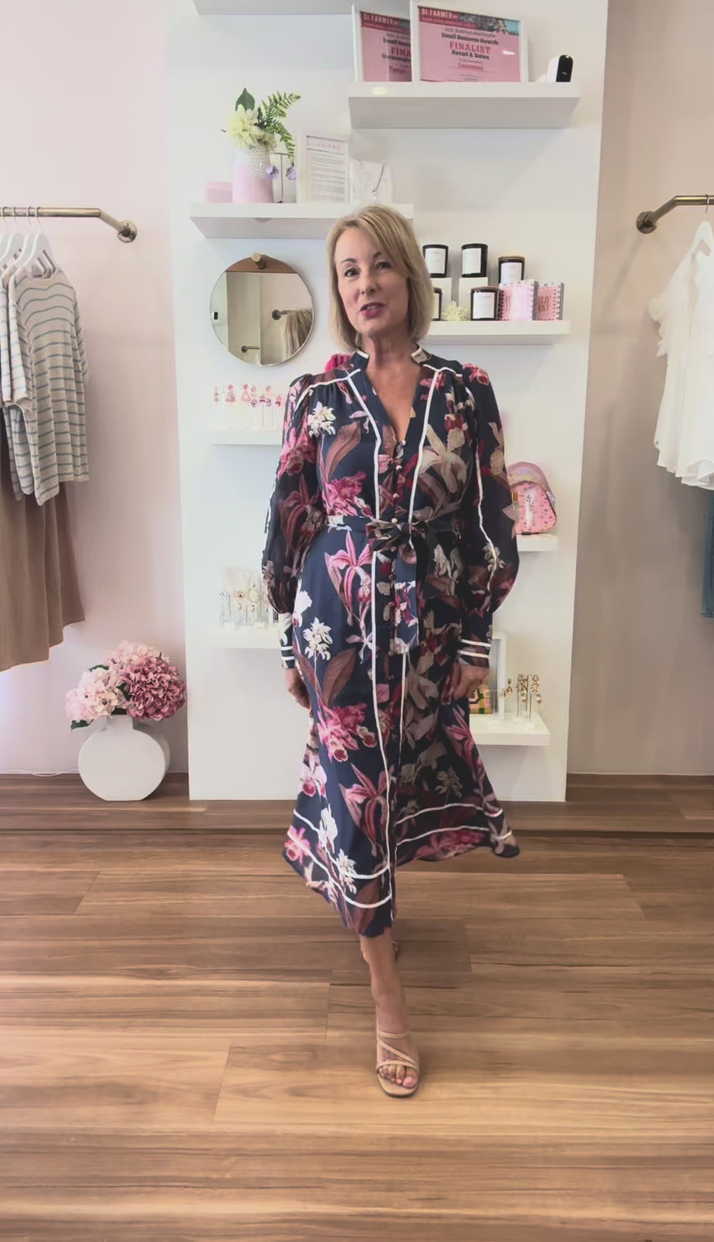 Our Constance Dress is a lovely elevated style. Made from a soft chiffon fabric with a navy base and a lovely multi print in pink, cream, beige and brown tones, this dress can be worn to the office or for a special occasion, style her up with heels and a cream clutch. Features a button front, making it feeding friendly and this shirt dress is flattering for most body shapes.