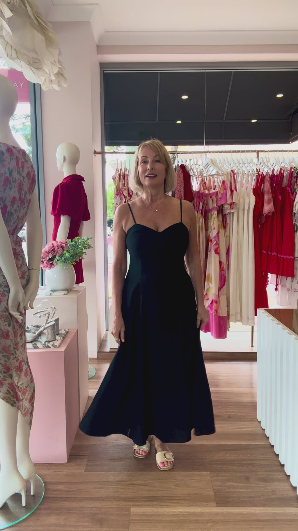 Meet our Delani Maxi Dress - the black essential that works as hard as you do. With its fitted bodice and adjustable straps, you'll enjoy a custom fit that flatters your silhouette, while the sweeping maxi length skirt delivers understated sophistication. Transition seamlessly from day-time ease to evening glamour with a change of accessories - gold accents for a polished look or keep it relaxed with the Rumer Slides and a neutral bag. Versatility has never looked this good!