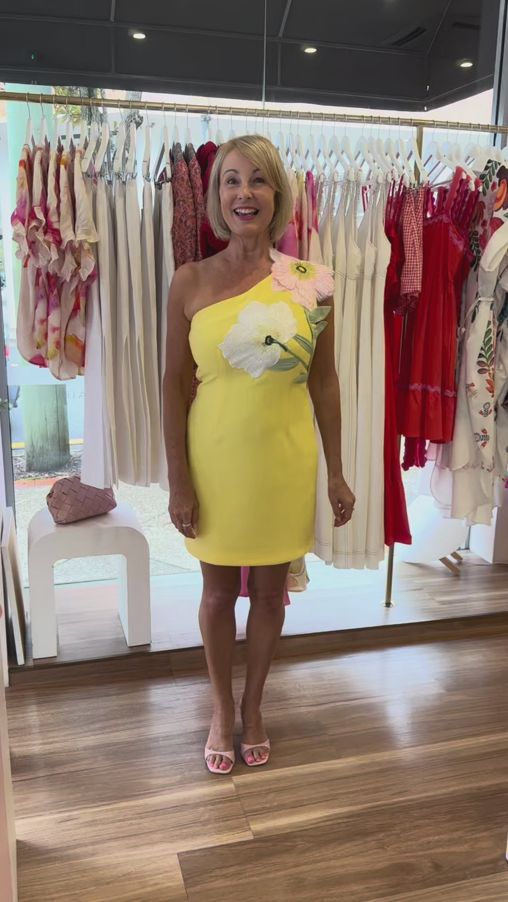 A perfect blend of modern elegance and playful femininity, our Hope Mini Dress is crafted from a luxurious Bella stretch crepe fabrication in a fab yellow and the asymmetric one-shoulder neckline creates a chic and contemporary look. A standout feature is the large 3D floral trim, delicately embroidered in soft pink and white - this detail adds depth, texture, and a playful, romantic element. It has a fitted silhouette that flatters the figure while providing comfortable stretch, allowing freedom of movement without compromising style.