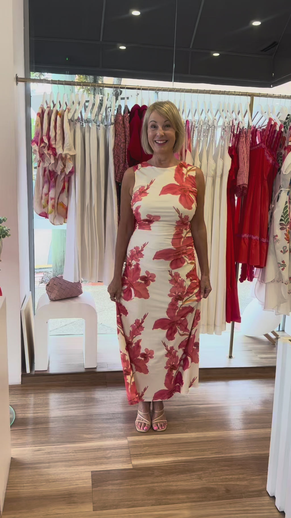 Our Isla Mesh Dress is that outfit you can rely on again and again. Crafted in a soft stretch mesh fabric with a bold peach floral print, it features a round neckline, sleeveless design and the silhouette hugs the body with subtle ruching through the waist for a sculpted, feminine fit. Lightweight and fully lined, it moves effortlessly from day to night with ease. Its an elevated statement piece made for warm evenings, events and everything in between.