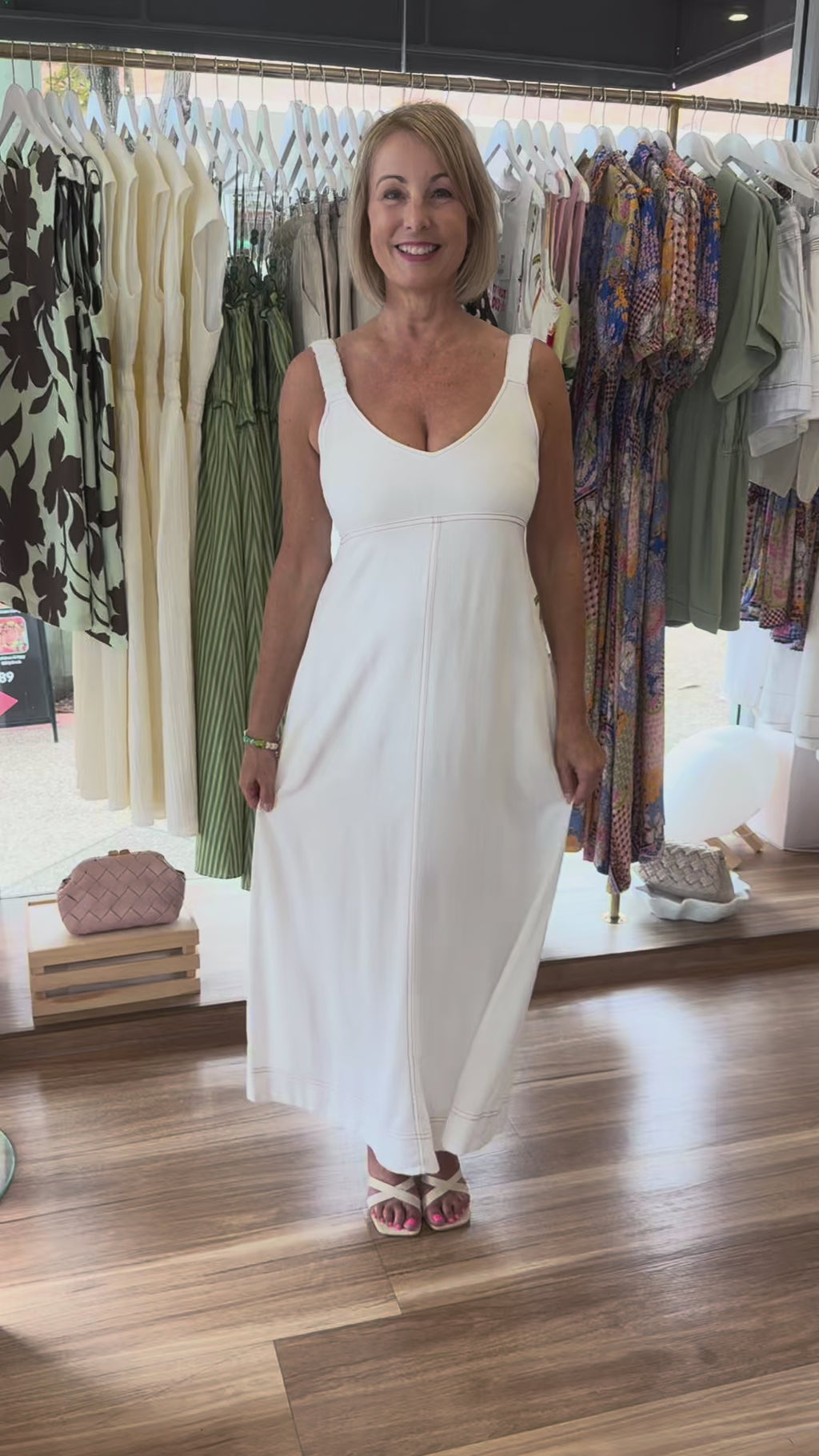 Our Jennie Maxi Dress will be a fab new addition to your wardrobe. This white sun dress is lightweight and comfortable to wear all day and night. Made from a linen blend fabric with contrast tan top-stitching, it features a fitted bodice, adjustable (bra friendly) shoulder straps and a full maxi length skirt. Elevate it with colourful accessories or keep it casual with our gold Taron Slides.