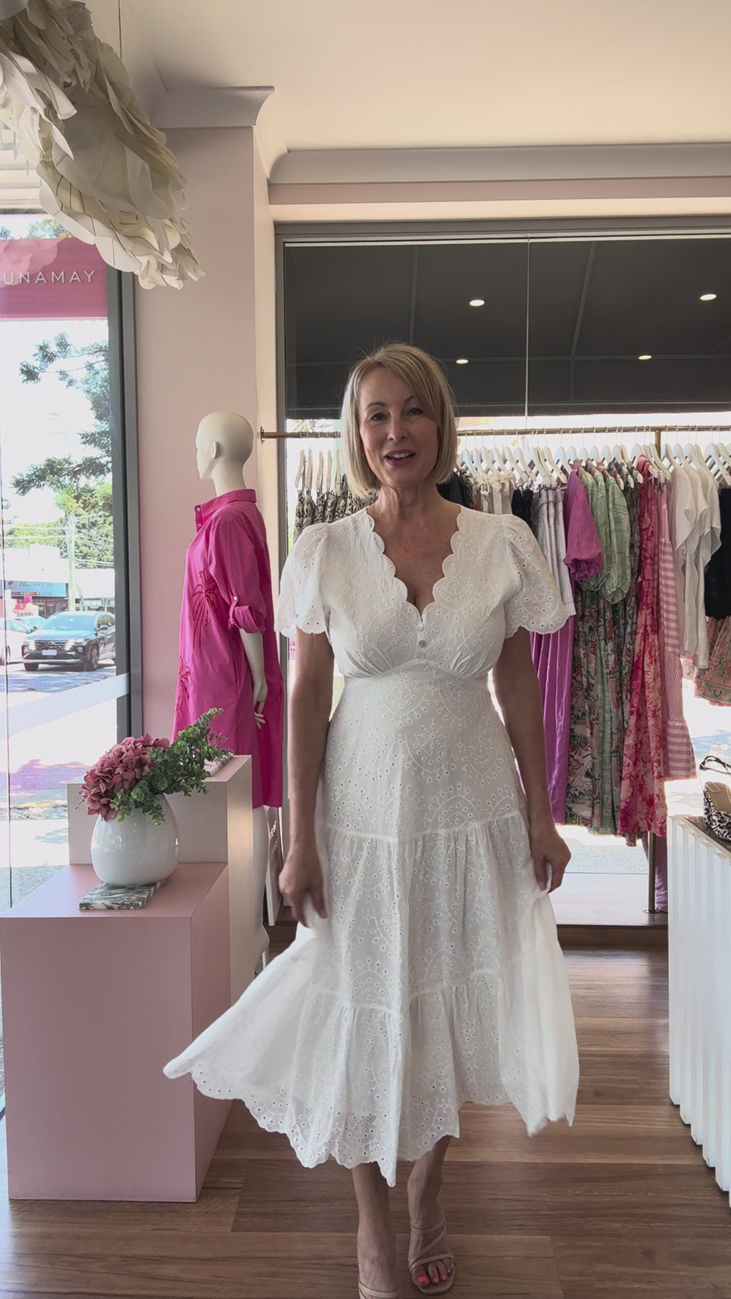 Our Kaydence Dress is a stunning choice, perfect for a variety of occasions. Crafted from a white broderie anglaise fabric, it features gorgeous scalloped detailing on the neckline and a tiered midi skirt. With an elegant fit and flare shape, this dress can be paired with heels and a clutch for a stylish day-time look.
