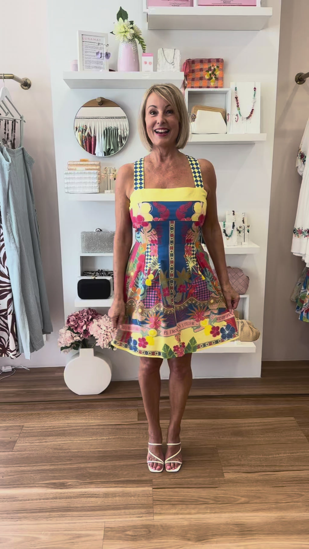 Our Liyana Mini Dress is a fab choice for those seeking understated glamour with maximum impact. This stunning dress is made from a linen blend fabric with a colourful 'Rio print and features cross-over straps on the back while the sculpted bodice provides a flattering fit before it falls to an Aline mini skirt. Perfect for weddings, parties and celebrations, pair with heels and gold accessories for a sophisticated look.