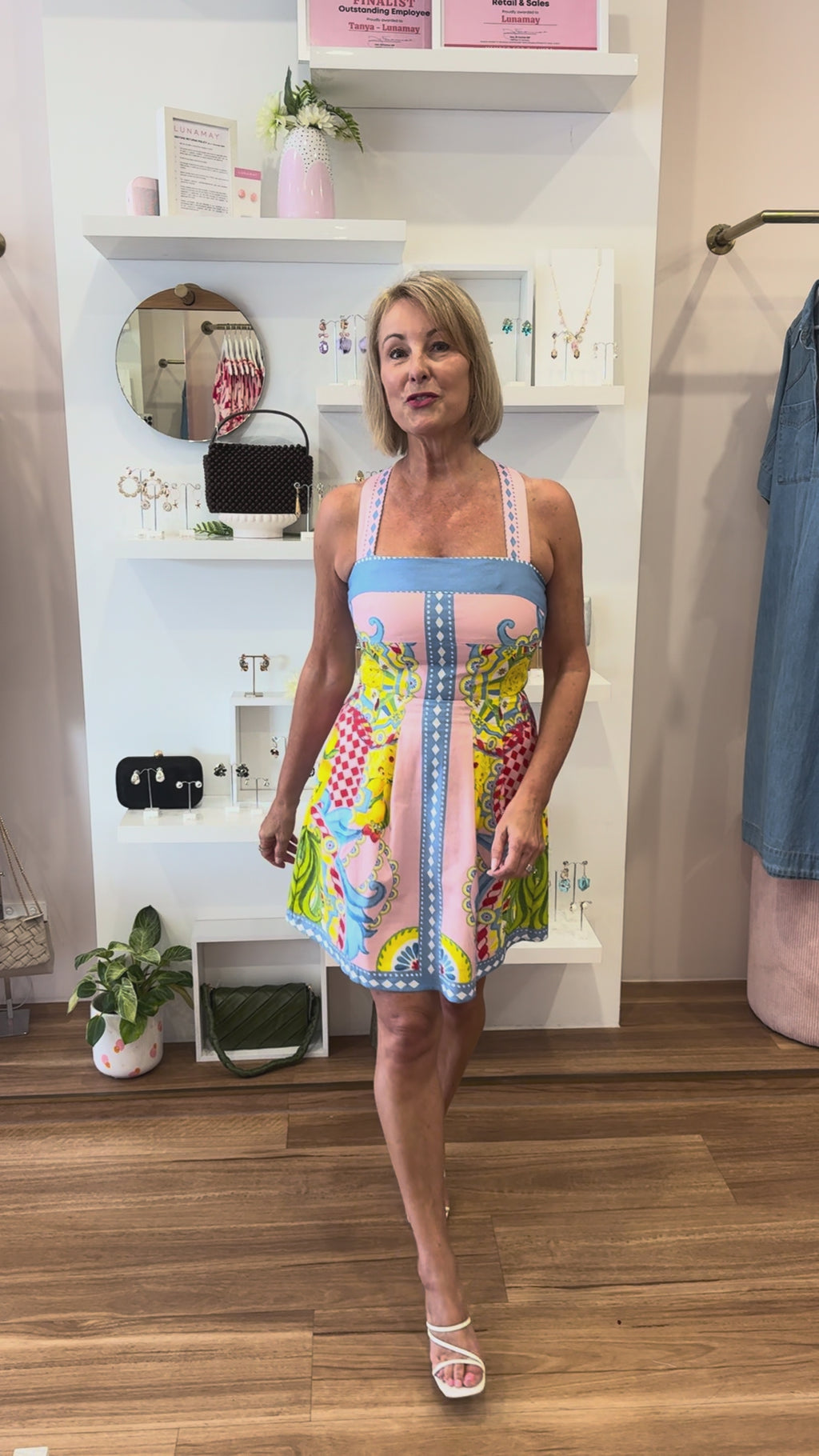 Our Liyana Mini Dress is a fab choice for those seeking understated glamour with maximum impact. This stunning dress is made from a linen blend fabric with a colourful 'Sicily' print and features cross-over straps on the back while the sculpted bodice provides a flattering fit before it falls to an Aline mini skirt. Perfect for weddings, parties and celebrations, pair with heels and gold accessories for a sophisticated look.