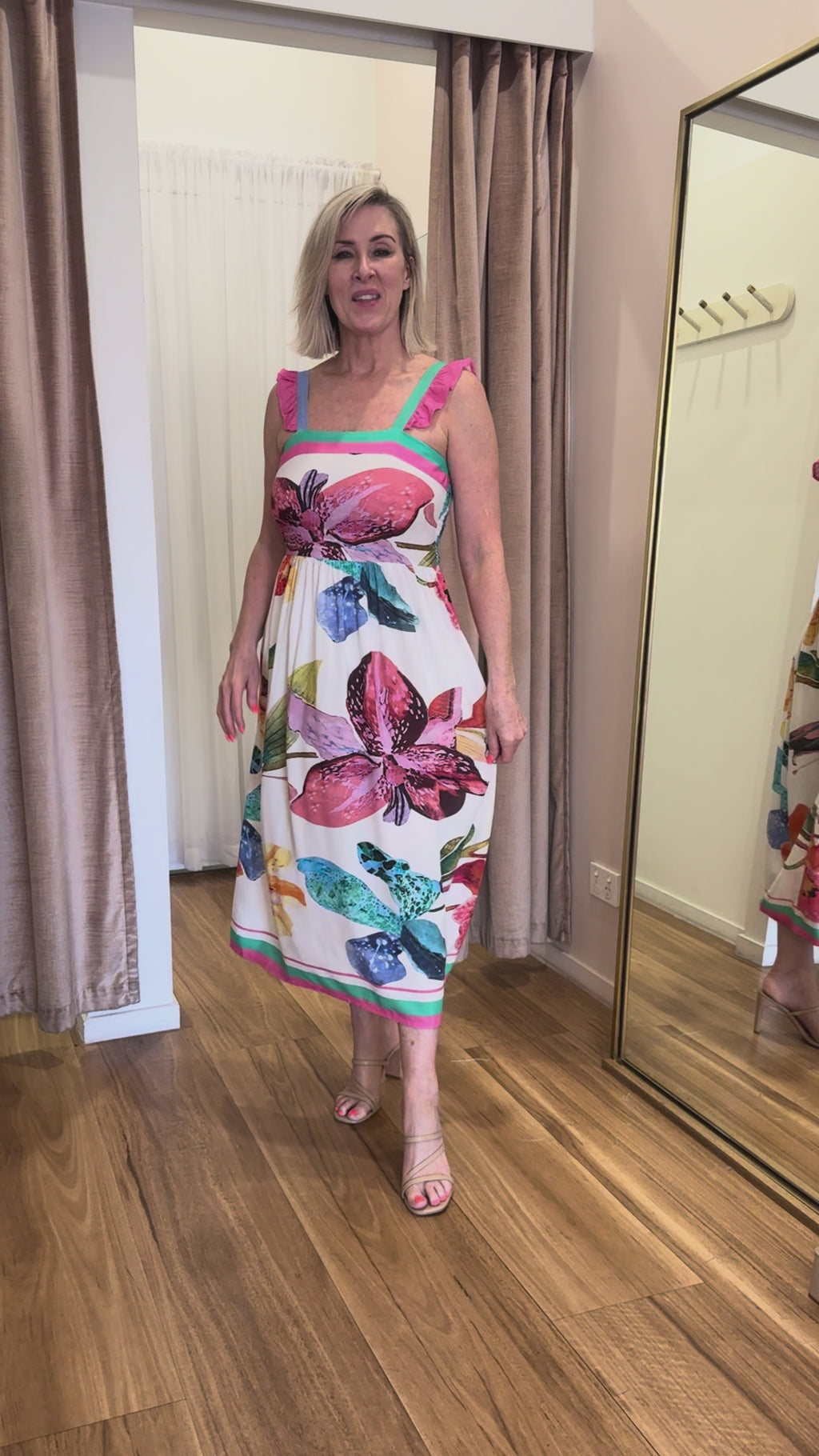 Our Orchid Ruffle Midi Dress by Joop & Gypsy, is an easy-wear style that's perfect for warm days and relaxed occasions. Made from a lightweight viscose fabric with a colourful floral print, this lovely midi dress features frill shoulder straps, the shirred back allows an easy it and it also has pockets. Wear it during the day with slides and elevate the look at night by pairing it with heels and a blue clutch.