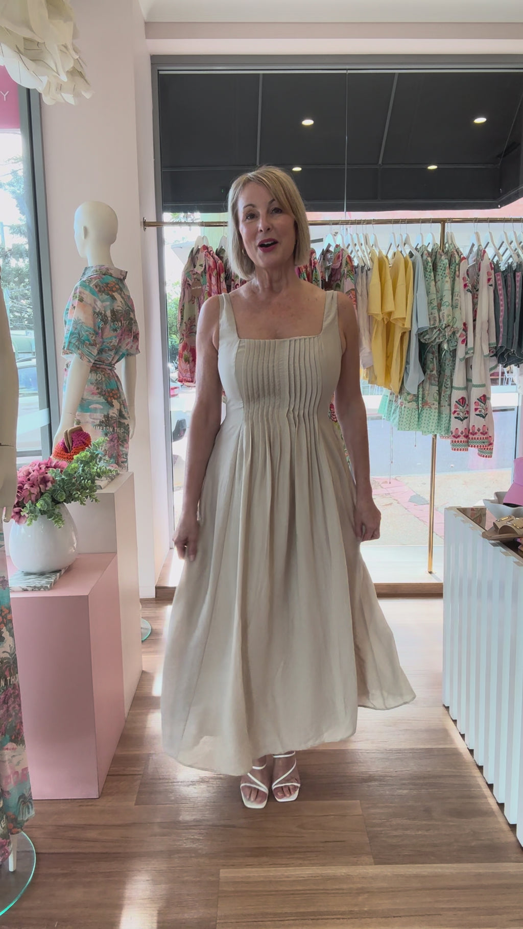 Our Reem Midi Dress offers effortless style you’ll love to wear repeatedly. Made from a soft rayon blend in a natural shade, this beautiful dress showcases delicate pleating on the bodice and a flowing A-line skirt. For daytime, team it with our Monroe Slides and when the sun sets, enhance your look with Lettie heels, a clutch and gold accessories for a refined finish.