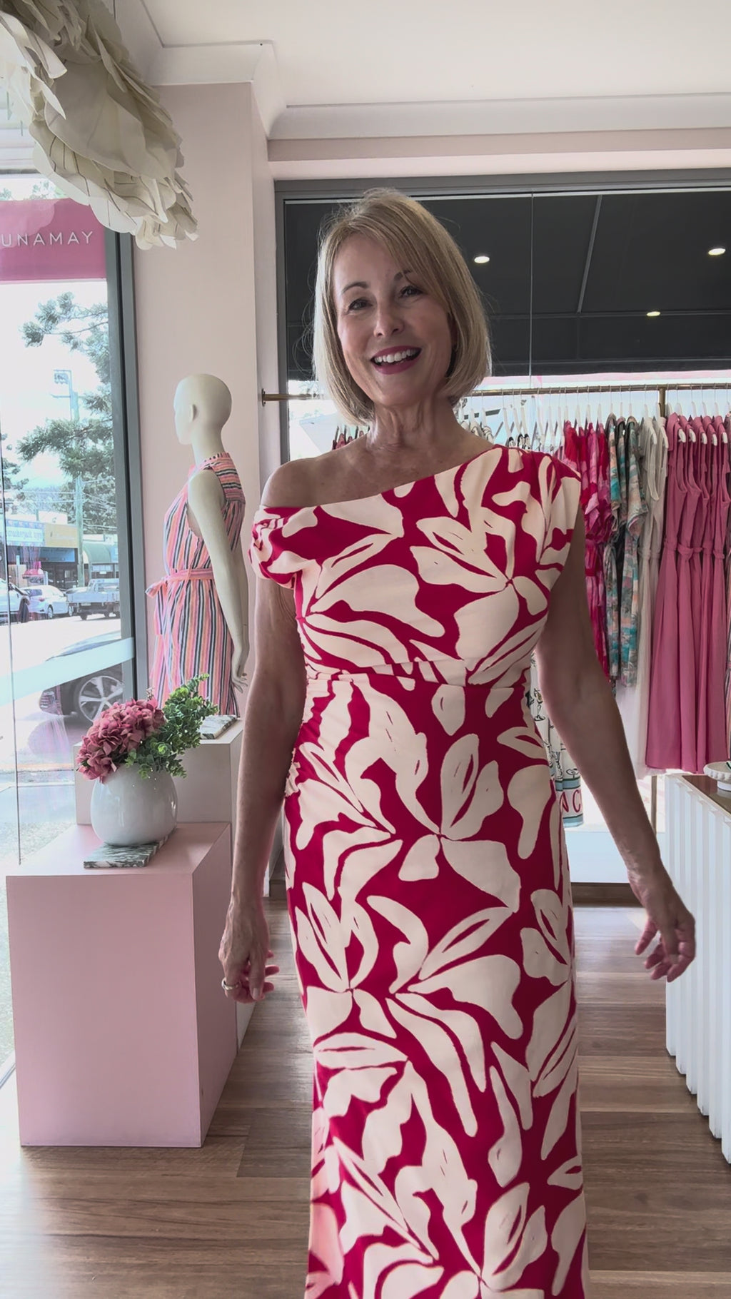 Our gorgeous Serata Asymmetrical Dress is perfect for every day wear and it will also have you party-ready! Made from a lightweight fabric with an exclusive red and cream floral print, this stunning dress features an asymmetrical neckline and it has a fitted silhouette. Wear it with slides throughout the day and swap them out for heels when you're heading out at night.