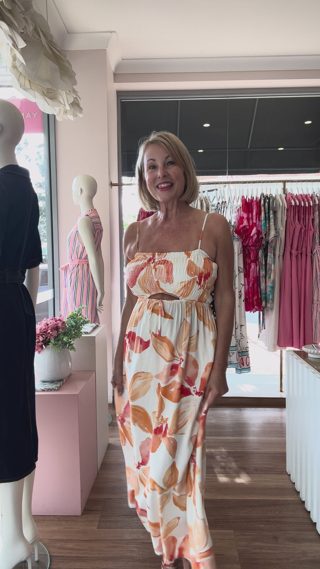 Made for effortless Summer days, our Solana Shirred Midi Dress has an exclusive orange and white print and it features a shirred bodice with a subtle cut-out and a flowing skirt. Balancing comfort with coastal sophistication, this dress an easily be styled up or down with a change of shoes.
