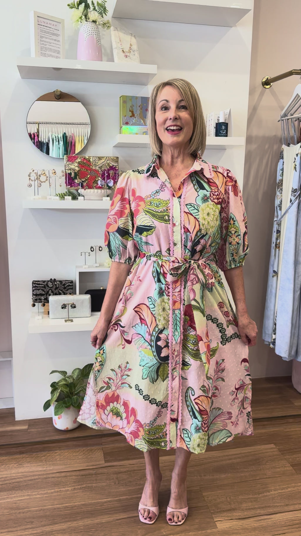 Our St Tropez Dress is just stunning. Crafted from a lightweight dobby fabric that will feel breathable and comfortable all day, this dress features an elegant floral pattern, beautifully enhanced by delicate pink crochet details on the collar and extending along the button front. Perfectly versatile, this floral short sleeve dress transitions seamlessly from the office to casual weekend outings.