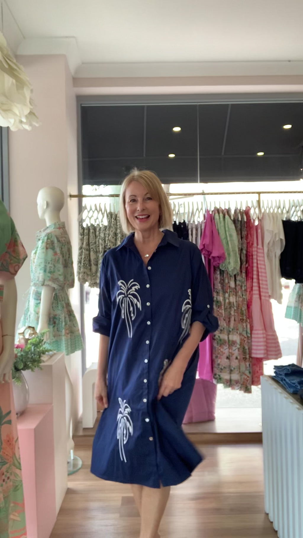 Our Sunset Palm Dress offers versatile styling and captures the spirit of a carefree holiday. Crafted from a soft cotton poplin in navy, it features gorgeous white embroidered palm trees on both the front and back. This shirt dress includes a button down front, full length sleeves with tab details and it has a flattering Aline shape. Perfect for a girl's lunch paired with heels and a raffia clutch or dress it down with slides and a crossbody bag for a laid-back look.