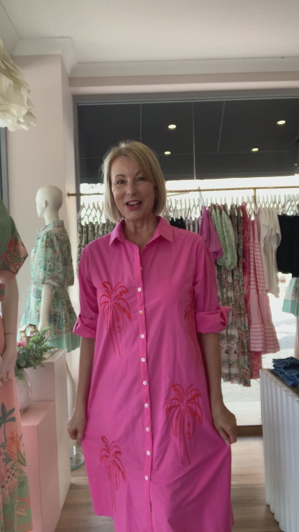 Our Sunset Palm Dress offers versatile styling and captures the spirit of a carefree holiday. Crafted from a soft cotton poplin in vibrant pink, it features gorgeous orange embroidered palm trees on both the front and back. This shirt dress includes a button down front, full length sleeves with tab details and it has a flattering Aline shape. Perfect for a girl's lunch paired with heels and a raffia clutch or dress it down with slides and a crossbody bag for a laid-back look.