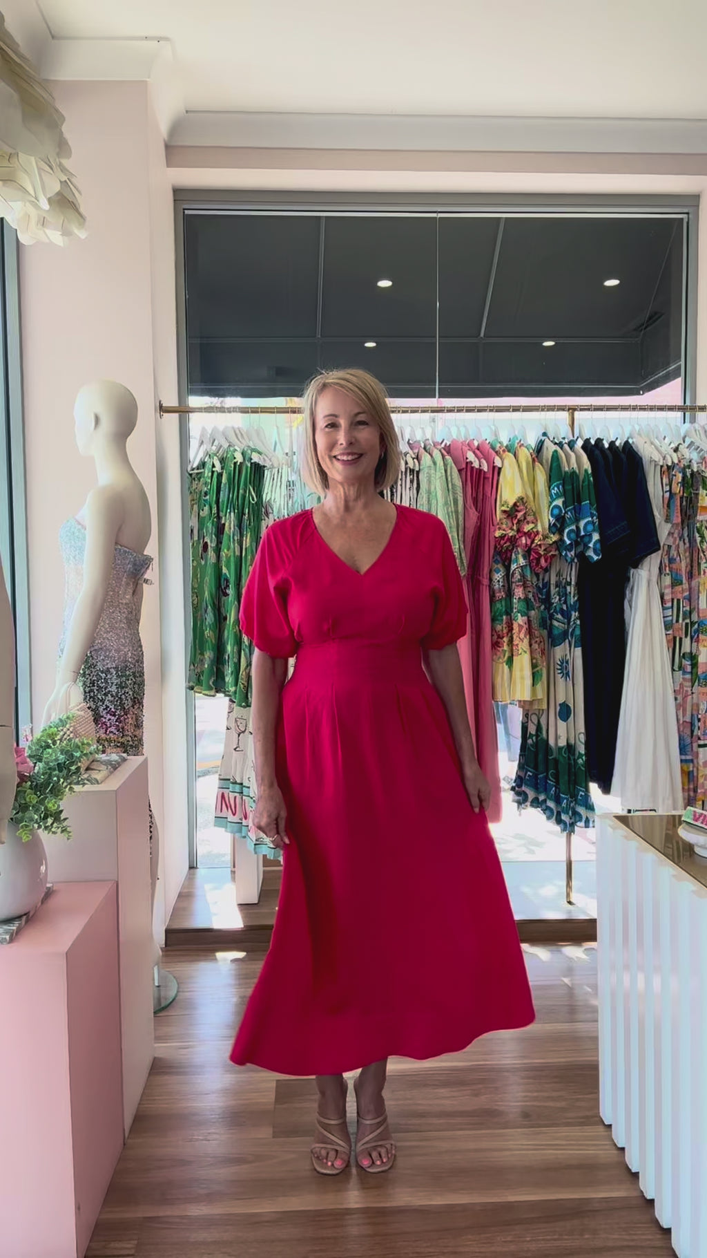 Elevate your Summer style with our Valentina Midi Dress. Crafted from a lightweight fabric in red, this gorgeous midi dress features a V neckline while the fitted waist cinches to create a polished silhouette. This dress is your answer to every occasion - from leisurely weekend brunches to romantic seaside escapes. Its versatile, comfortable and undeniably chic.