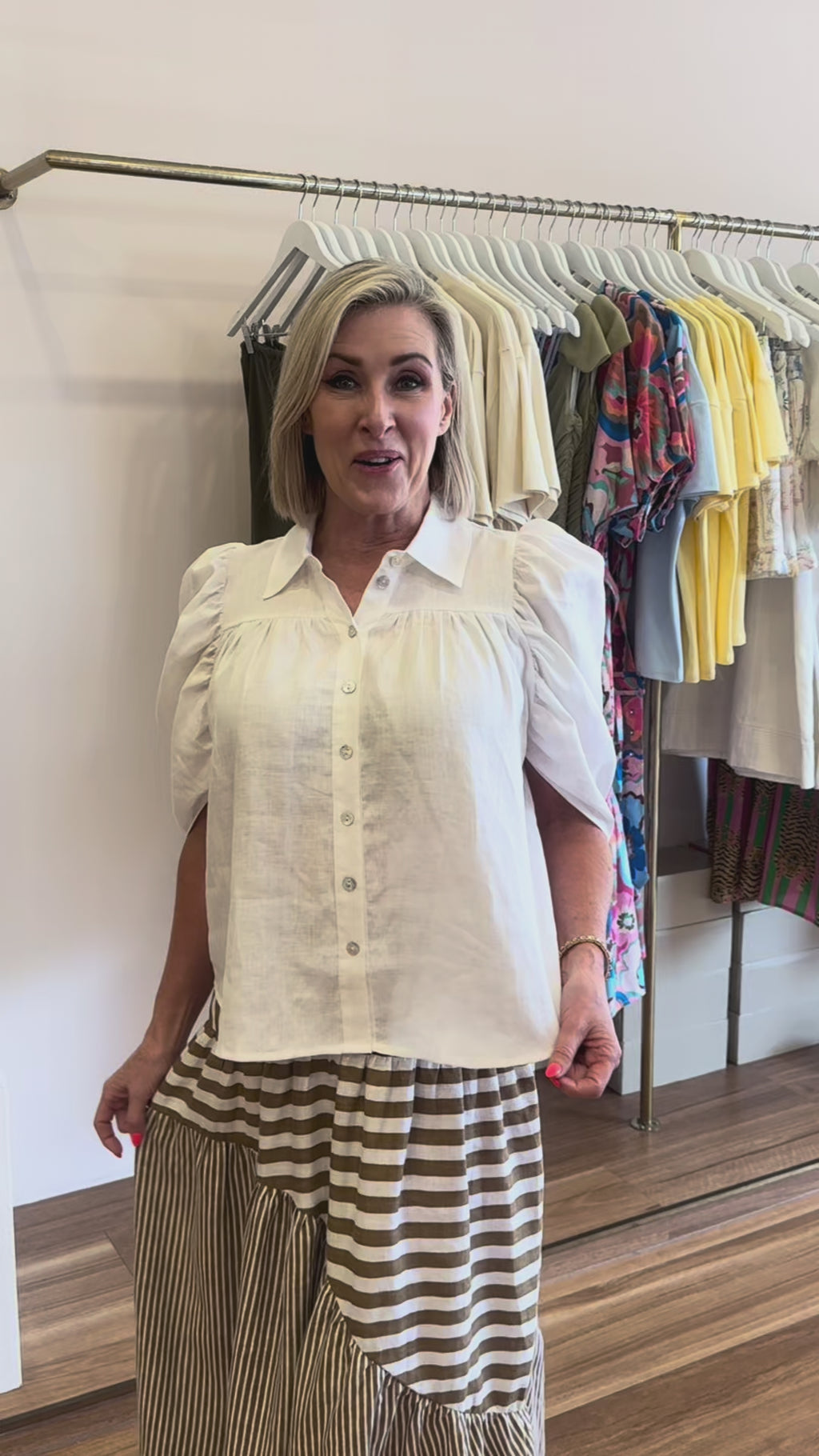 Introducing the Holly Shirt - a striking top that feels like it’s fresh from a chic Mediterranean beachside lunch. Featuring soft puff sleeves and embroidered detailing on the back (tout est magique - meaning everything is magical), this white shirt brings a little bit of drama and no doubt alot of compliments. Made from a light, breathable fabric, it can be worn effortlessly with shorts, skirts, jeans, or pairs perfectly with our Simone Skirt (pictured).