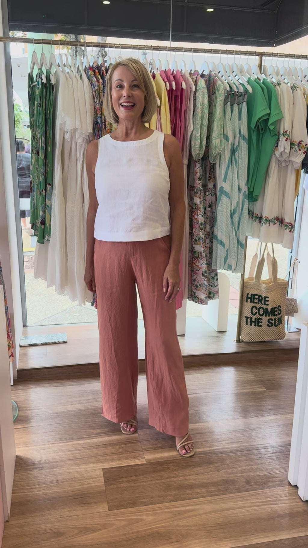 Our Jude Linen Top is one of those must have wardrobe staples - it effortlessly completes any outfit from work to the weekend. This sleeveless top is made from a lightweight linen fabric in white and the relaxed silhouette makes it easy wearing. We suggest pairing it with our Della Linen Pants (pictured) or our Sofie Stripe Shorts.