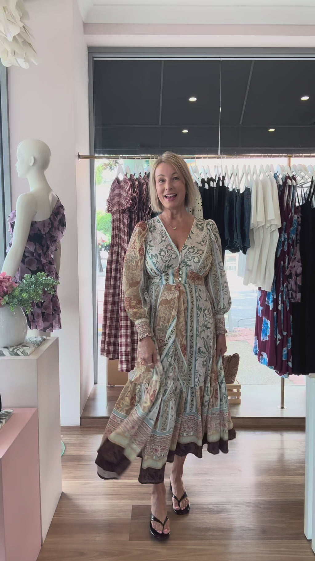 Our Jenae Maxi Dress is effortlessly stylish and perfect for most occasions. This gorgeous dress has a lovely bohemian vibe and is made from a lightweight fabric with a green, brown and cream print. Features a button front, flat panel on the waist which creates a flattering silhouette and it has a maxi length skirt. You will love this easy 'one and done' outfit that will make you look and feel fabulous. Keep her casual with slides or style her up with wedges or ankle boots.