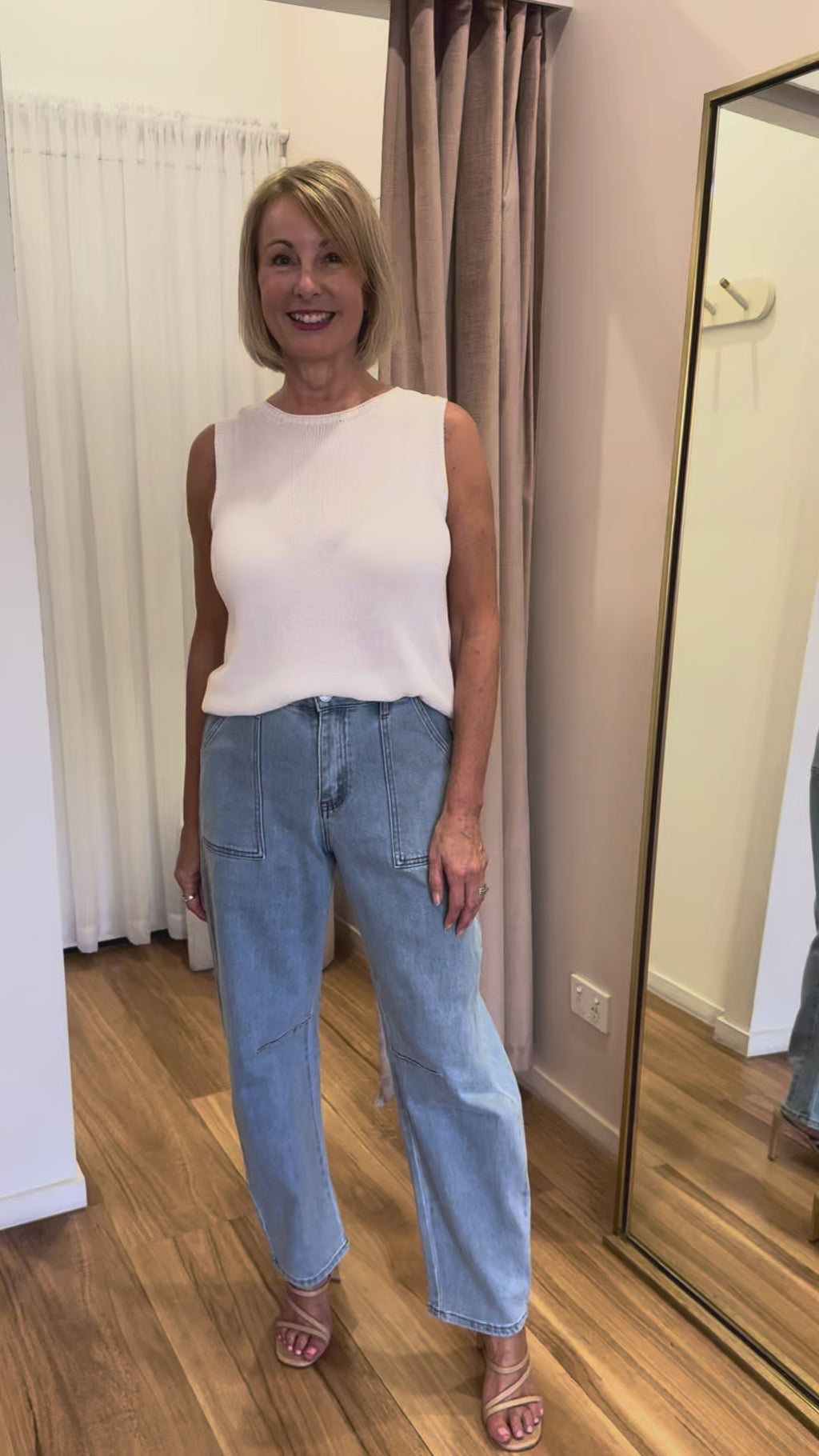 Our Gia Bowie Barrel Jeans are instantly flattering. They feature a relaxed (curved) fit through the leg, widening at the thighs and then tapering in at the ankle. Crafted from a soft denim in a light blue wash, these jeans have a fitted waist, deep patch pockets on the front and they also have a slight stretch which makes them comfortable to wear all day and night.  Pair these jeans with our Spring Knit Tanks and heels for an effortless look however they will also look fab with a sleek thong or sneaker.