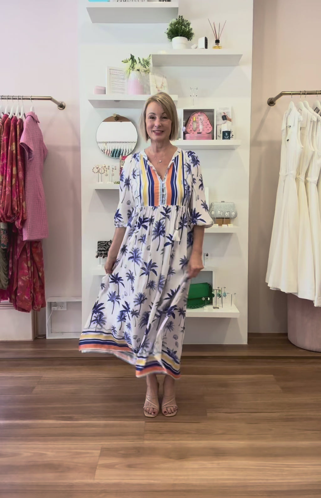 Our Santi Maxi Dress is the perfect effortless outfit. Crafted from a lightweight fabric with a tropical (blue palm) print, this babydoll dress features a button bodice, half length sleeves, convenient pockets and a full maxi length skirt. You'll adore its easy, comfortable fit - wear it casually with slides and a crossbody bag or dress it up with wedges and matching blue accessories.