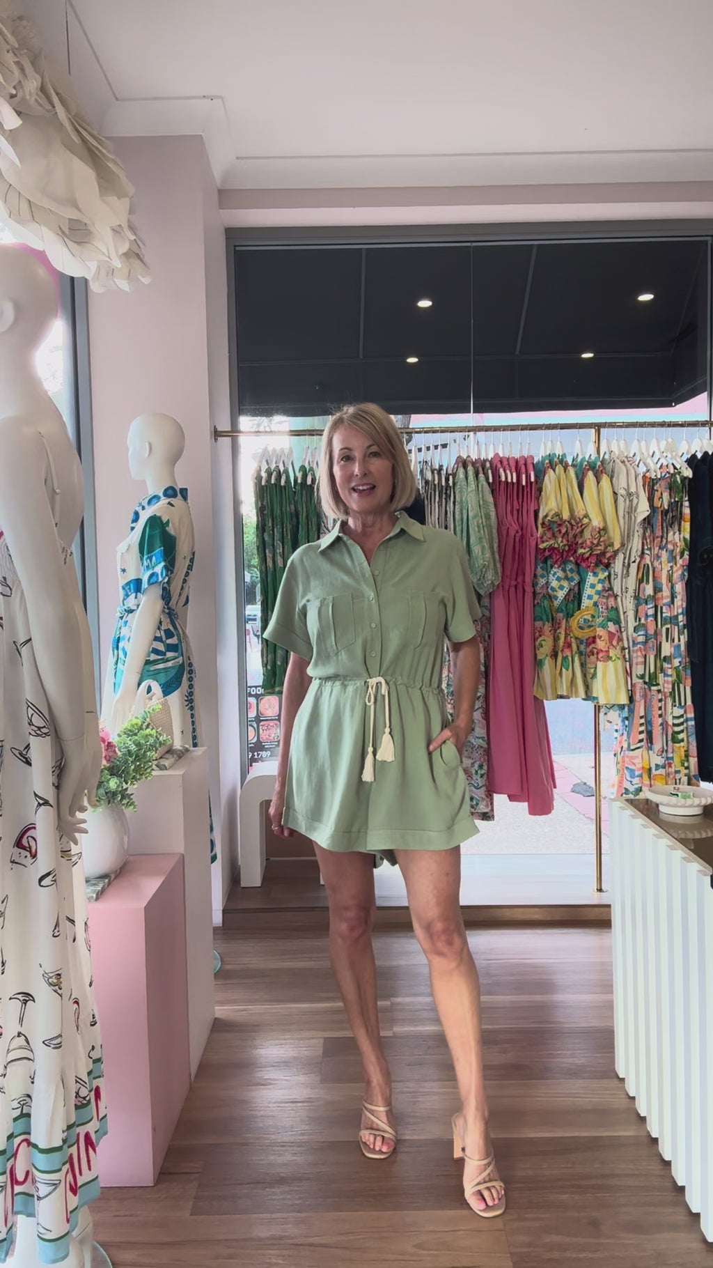 Elevate your casual wardrobe with the Cooper Playsuit in a lovely sage colour. This versatile piece combines timeless style with practical details - a button front, adjustable drawstring waist and functional side pockets make it effortlessly wearable. Transition seamlessly from relaxed weekend vibes to lunch dates by simply switching your footwear. Slip on our Ravielle Slides for laid-back comfort or pair with wedges to instantly elevate your look.