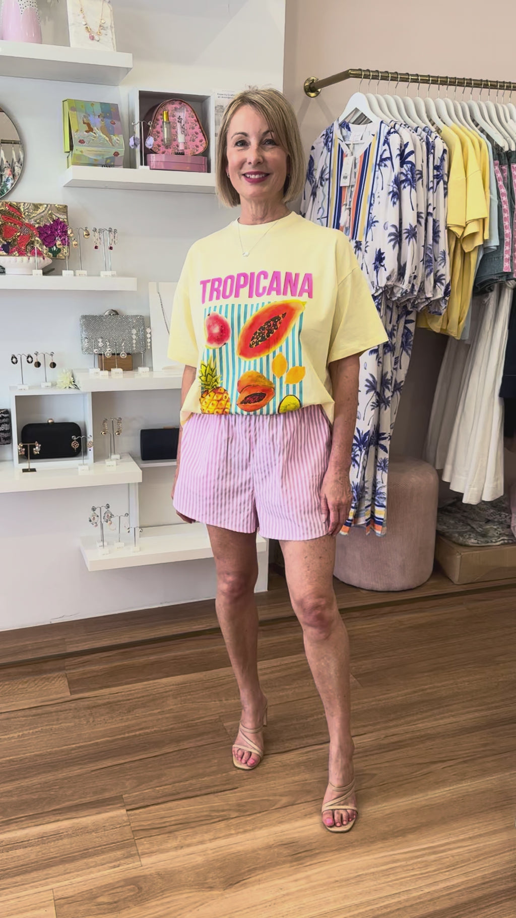 • tee - round neckline, drop shoulder, short sleeves, longer length, relaxed boxy fit, colourful Tropicana graphic print on the front