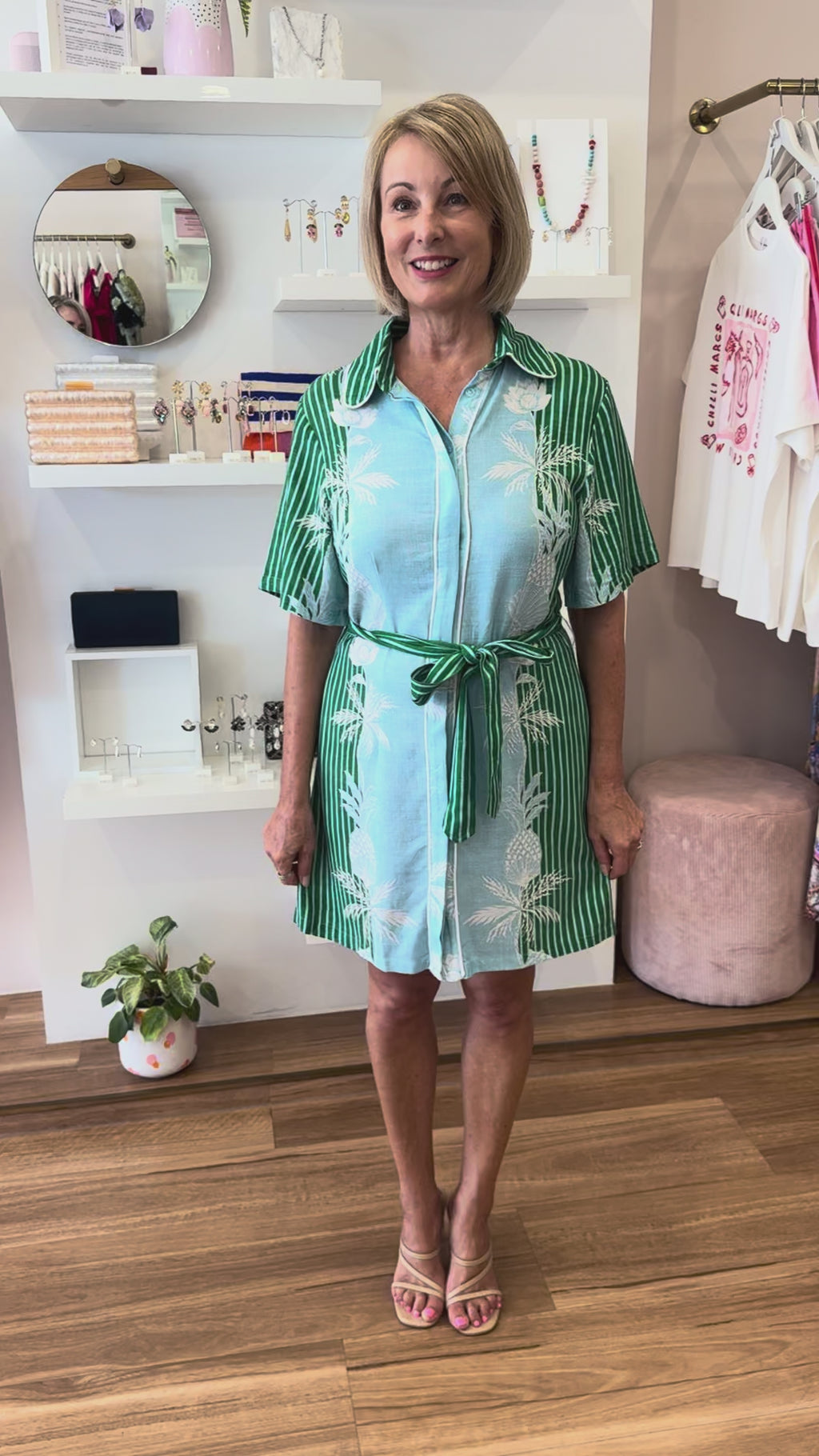 Our Bellini Shirt Dress is one of those easy styles that makes it look like you've put in minimal effort. Crafted from a breathable rayon and linen blend with an exclusive print in blue and green tones, this dress features a collar, short sleeves, button front and side pockets. It also has a fabric waist tie waist to create shape or of course, remove it if you prefer a relaxed fit. Its ideal for everyday wear - paired with slides throughout the day or style it up with heels if you're heading out for dinner.