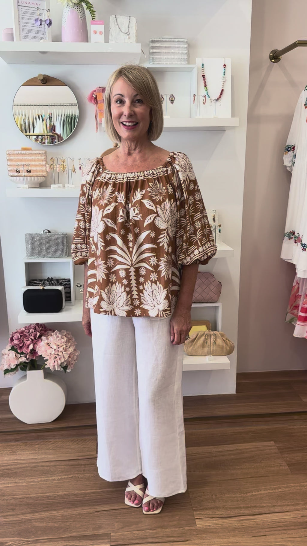 Embrace effortless elegance with the Kelsey Off Shoulder Top. Crafted from a lightweight and soft fabric with an exclusive 'Hawaii' print (coffee and cream tones), it features an elasticated neckline providing versatility - wear it on or off the shoulder. For a stylish look, pair it with our Jude Linen Pants (showcased in video) or keep it casual with our Billy Linen Shorts.