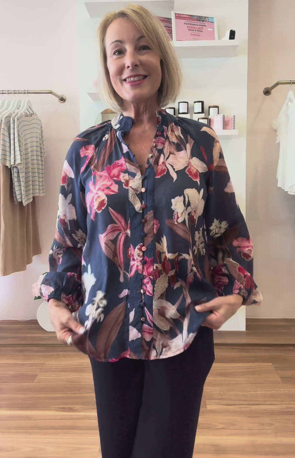 Our beautiful Lauryn Floral Shirt is crafted from a lightweight semi sheer chiffon fabric with a navy base and a multi coloured floral print in pink, cream, beige and brown tones. This top has a relaxed fit with a curved hem. Pair it with our Jude Linen Pants for a day-time look or when you're heading out to dinner, style her with our Maison Pants.