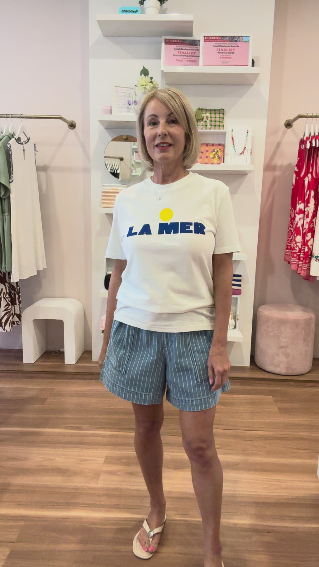 Our La Mer Tee by Little Palma will remind you of never-ending sunshine and the laziest of days! Made from a white cotton fabric with blue coloured letters (La Mer) with a yellow sunshine dot, this tee will be an instant fave and has a relaxed fit. Wear it with everything from denim, shorts or a skirt.