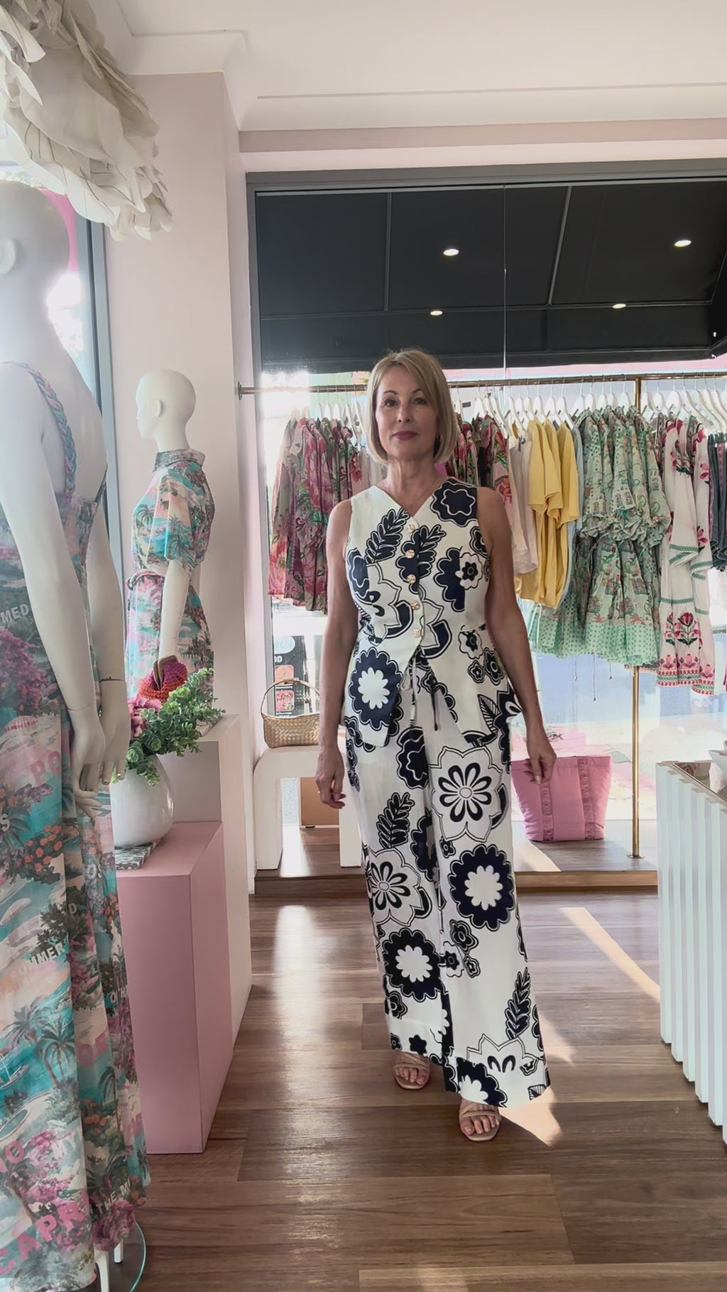 Discover our Mariela Vest, its perfect for pairing with denim or creating a chic co-ord set alongside the matching Mariela Pants. Crafted from a lightweight navy and white printed fabric, this sleeveless vest is accented with gold buttons down the front, adding a touch of elegance to your outfit.