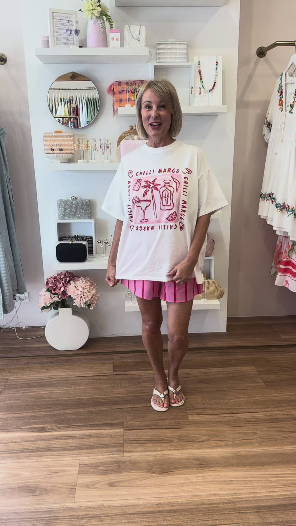 - tee - round neckline, drop shoulder, short sleeves, longer length, relaxed boxy fit, red 'Chilli Margs' print on the front