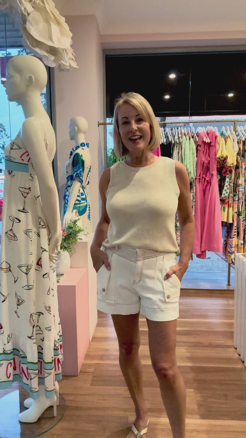Elevate your off-duty wardrobe with our Lenny Denim Shorts. These high waisted shorts have a flattering fit and are crafted from an off-white denim fabric. Features two large front pockets with fold over flaps secured with silver hardware which gives a touch of utilitarian charm. We suggest pairing them with our Spring Knit Tanks or your fave tee.