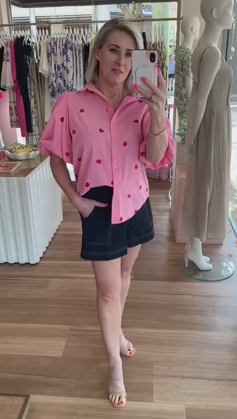 Add a playful twist to your everyday style with our Love Heart Shirt. Made from a pink cotton fabric, it also features exquisite red embroidered hearts scattered over the shirt and it has a relaxed fit ensuring versatility for any occasion - from morning errands to evening outings. Style it tucked into your fave denim shorts or wear it with our Alessia Linen Pants for an effortlessly chic look.