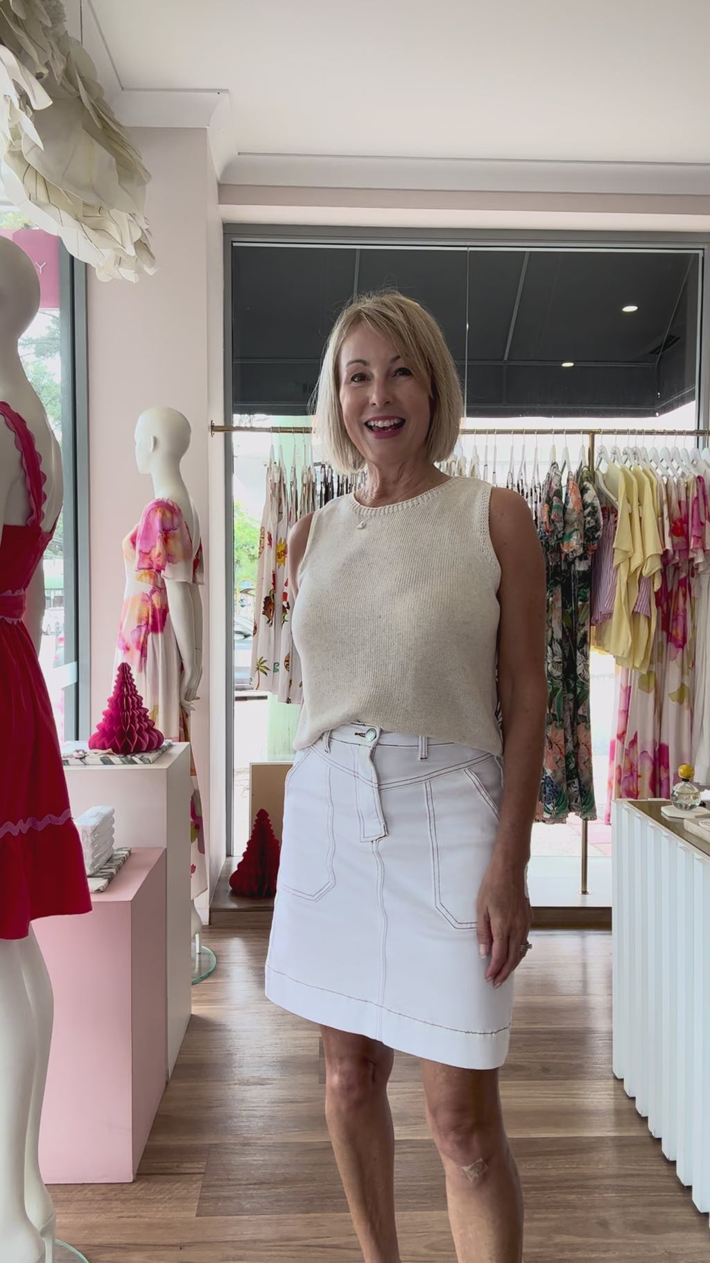 Our Rylo Denim Skirt will be your new Summer wardrobe essential. Made from a soft and stretchy fabric, this white denim skirt has a flattering Aline shape and features front patch pockets. We suggest pairing this skirt with our Spring Knit Tanks and slides for a casual vibe.